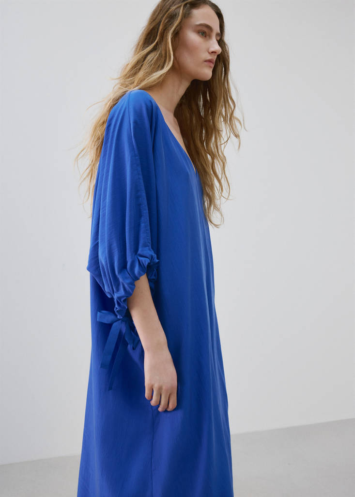 100% seda. Tejido de seda. Diseño corto. Diseño fluido. Cuello pico. Camisón estilo vestido. Manga tres cuartos abullonada