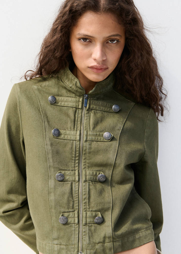 Tejido de algodón estilo tejano vaquero. Diseño entallado. Cuello de tira. Manga larga. Detalle de botones decorativos. Cierre de cremallera en la parte delantera
