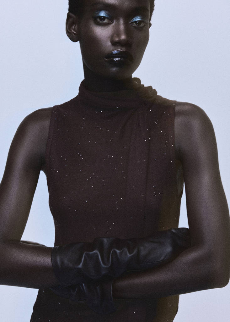 Tejido con brillos. Diseño entallado. Adorno de fular en el cuello. Tirantes anchos. Esta prenda pertenece a nuestra colección de fiesta y evento, diseñada para elevar tus looks en ocasiones especiales