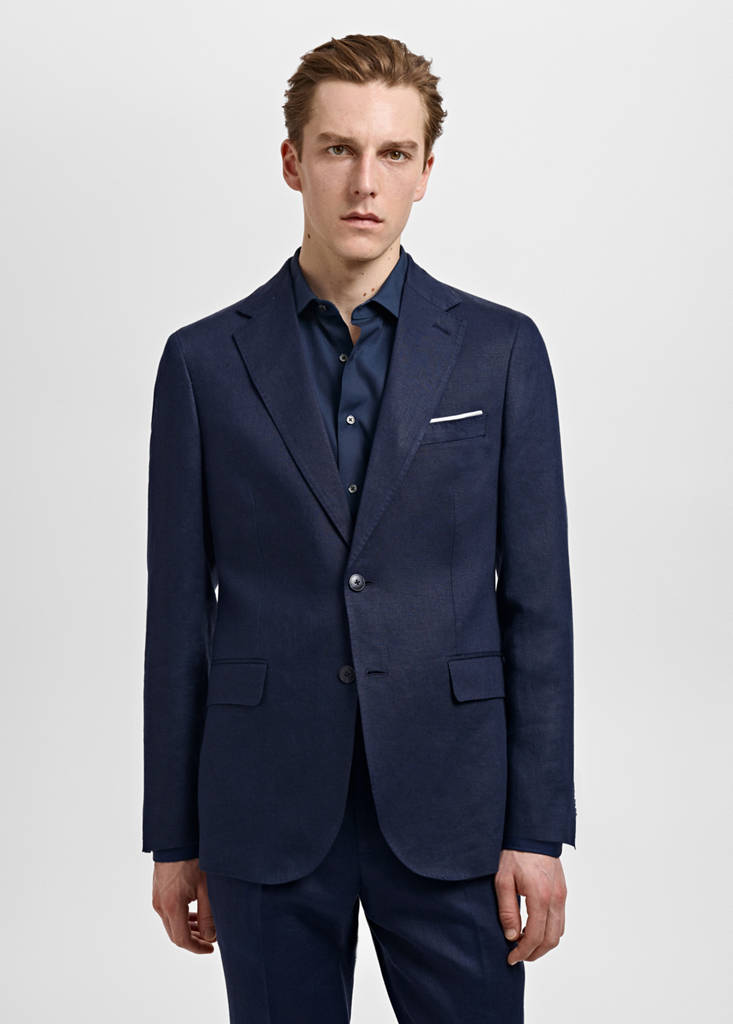 Slim fit. 100% Linen. Notch lapels and buttonhole. Chest welt pocket. Two front flap pockets. Long sleeves with buttoned cuffs. Inner lining. Inner pockets. Tailoring collection. Promotional product