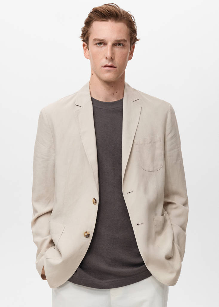Linen and lyocell blend fabric. Slim fit. Notched lapel collar. Front closure with buttons. Small patch pocket on the chest. Two side patch pockets. Tailoring collection