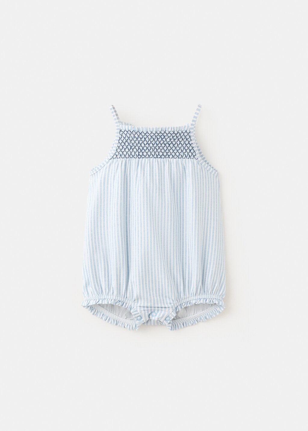 Full pyjama. Cotton fabric. Stripe design. Straight collar. Thin straps. Elastic gathered hem.