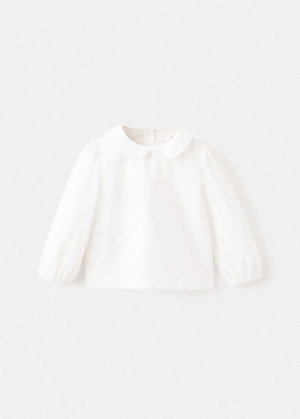 100% cotton fabric. Mesh design. Check-pattern. Peter Pan collar. Long sleeves with elastic cuffs. Button fastening on the back section.