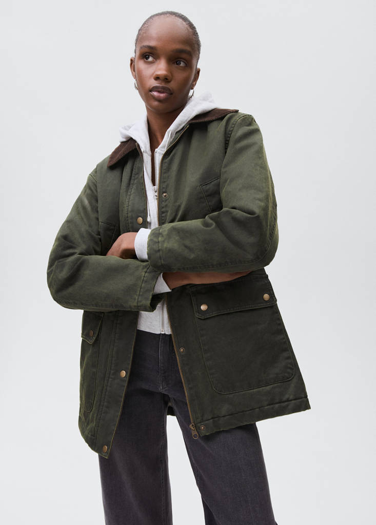Cotton fabric. Straight design. Contrast collar. Notched lapel collar. Long sleeves. Two side pockets. Twin buttoned flap pockets at front. Button and zip fastening
