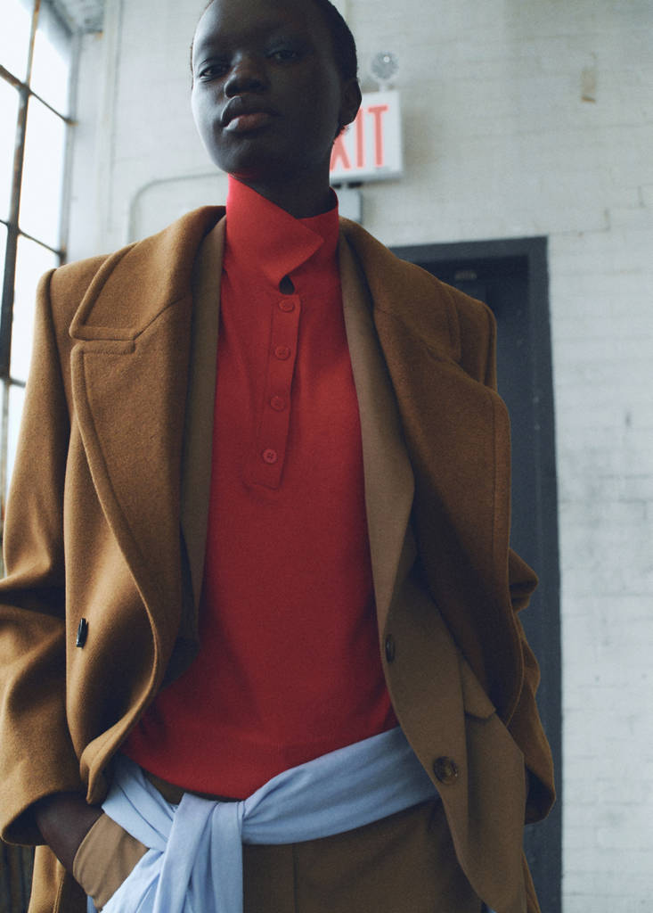 Wool mix fabric. Heavy structure. Straight design. Long design. Notched lapel. Lapel-collar V-neck collar. Lapel with notch. Long sleeves. Two side welt pockets. Double button fastening. Inner lining. Available Plus