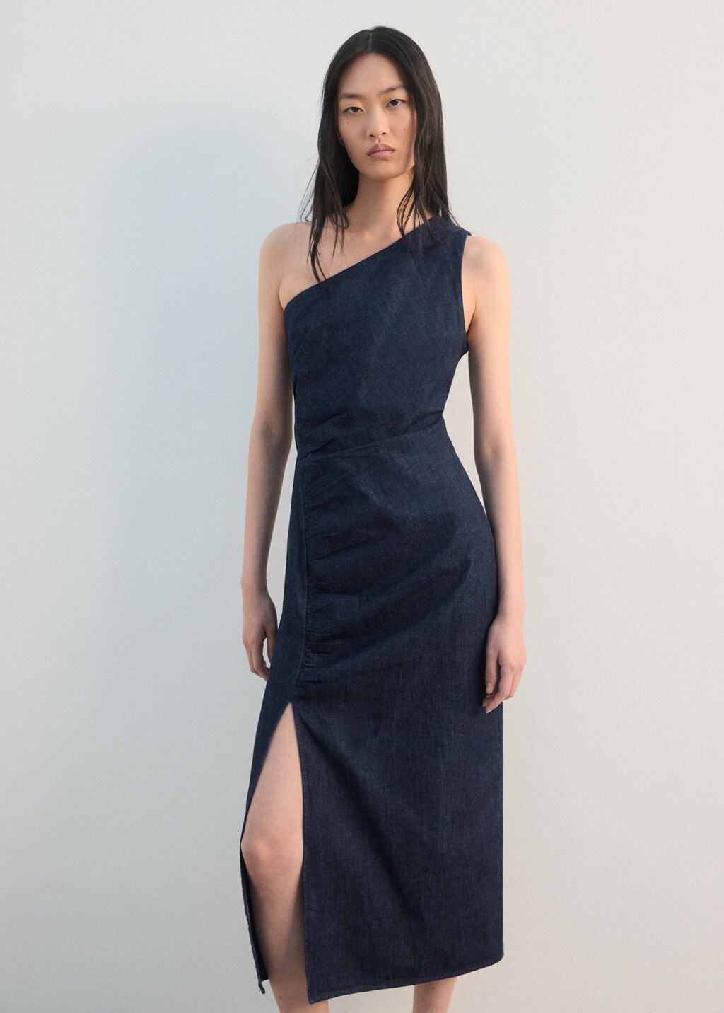 Denim-style cotton fabric. Midi design. Fitted design. Asymmetrical neckline. Sleeveless. Ruched panel. Side slit at the hem. Side zip closure.