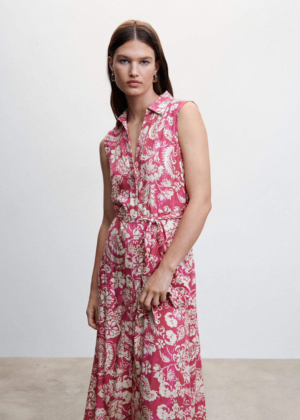 Flowy fabric. Shirt-style. Straight design. Long design. Floral print. Shirt-style collar. Sleeveless. Button fastening on the front section. Adjustable waist tie. Plus Size Available. The ecru colour is an online exclusive.