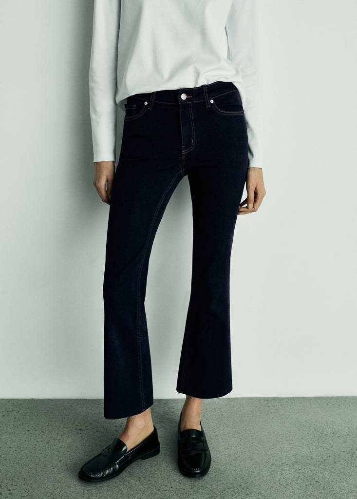 Denim-style cotton fabric. Stretch fabric. Flared design. Flare design. Crop design. Rinse wash. High waist. Belt loops. Five pockets. Zip and button fastening. Available Plus. Inside length 65 cm