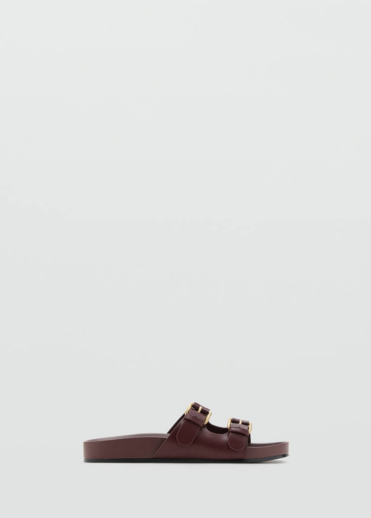 Flat design. Straps design. Straps with metal buckles. Open toe. No Fastening
