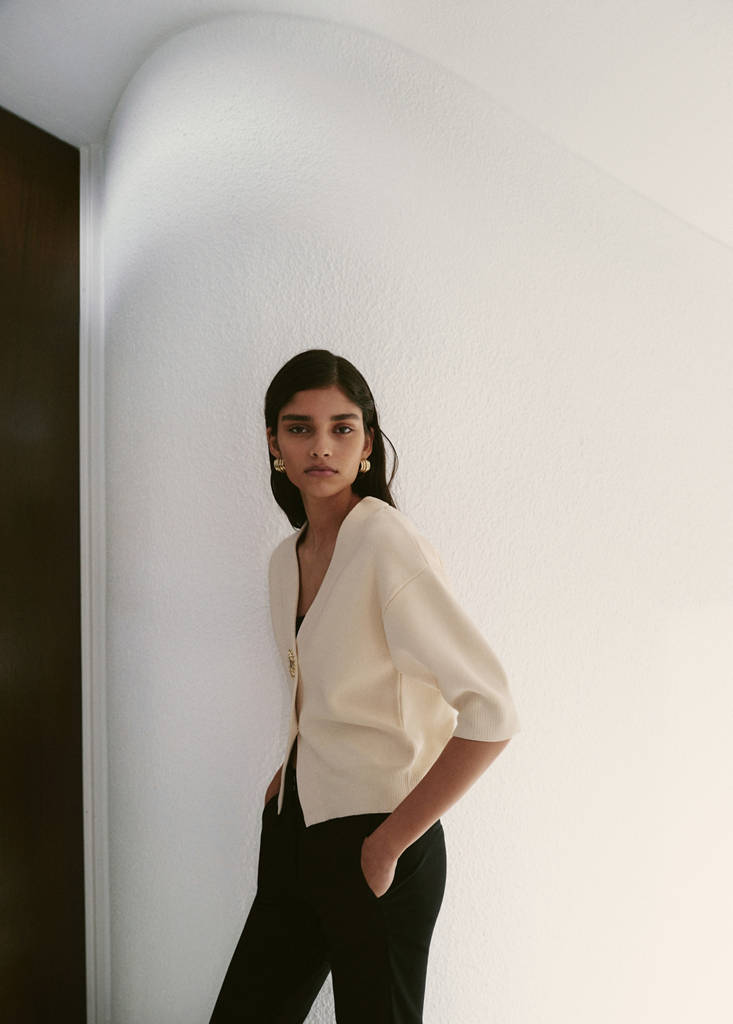 Fine knit fabric. Straight design. V-neck. Short sleeves. Front button closure. Jewel-effect button