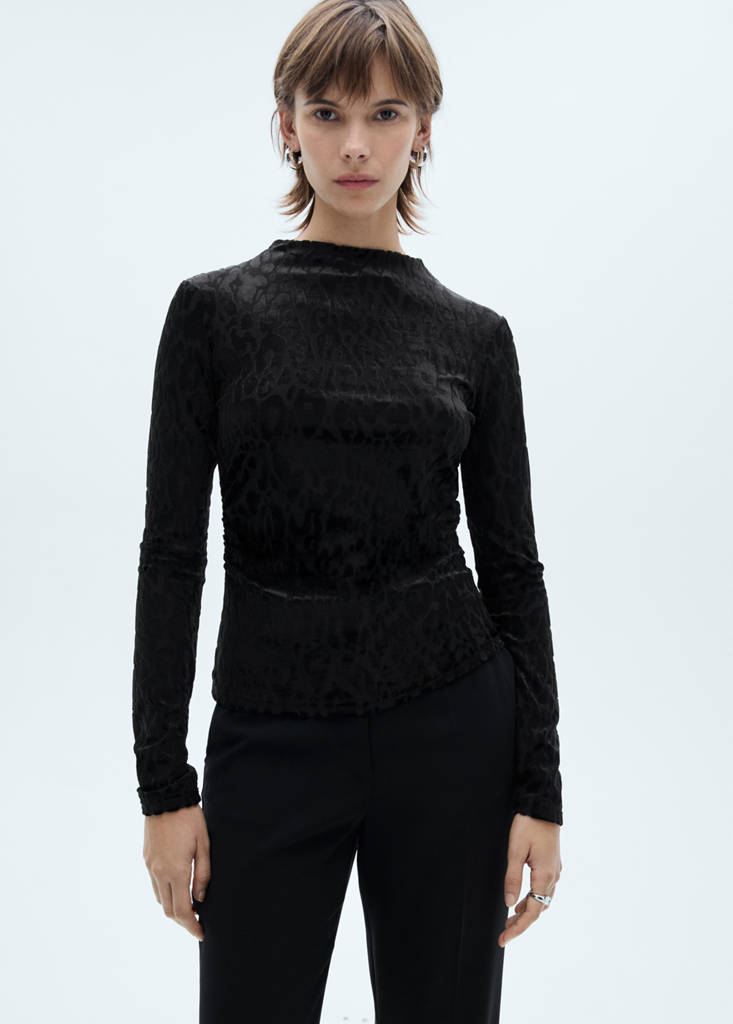 Fluid fabric. Fitted design. Leopard print. High collar. Long sleeves. No Fastening. Party, ceremony and communion collection