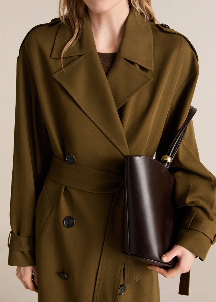Lyocell-blend fabric. Long design. Oversized design. Lapel-collar V-neck collar. Lapel with notch. Long sleeve with loops. Belt loops. Removable belt. Back vent at the hem. Double button fastening. Inner lining