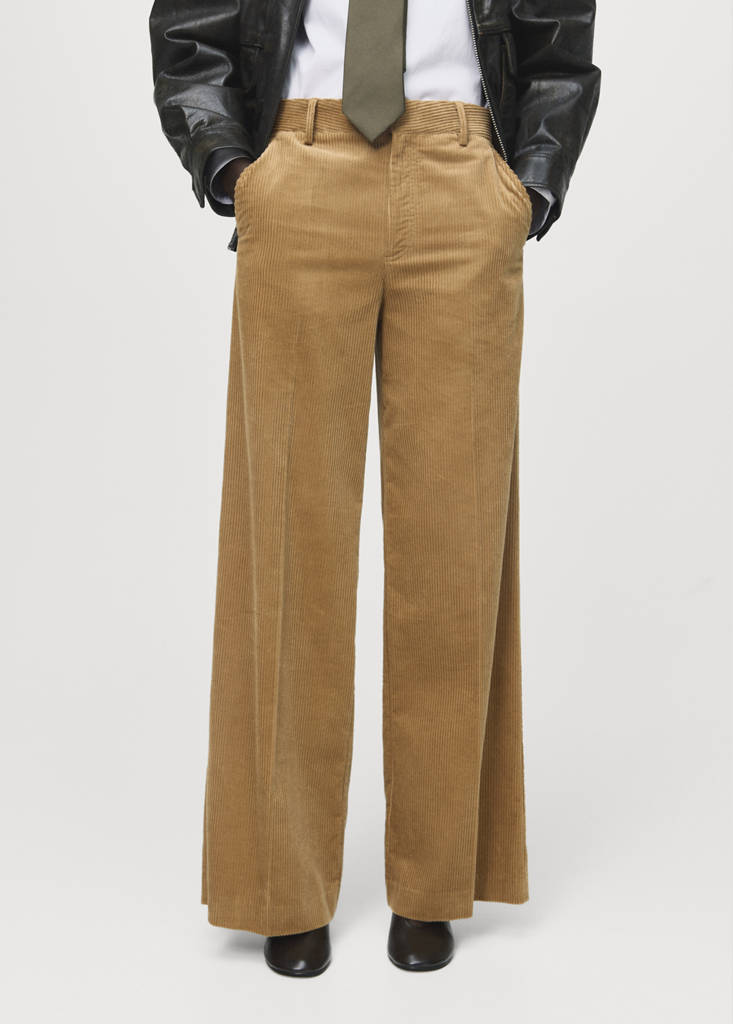 Corduroy fabric. Long design. Wide-leg design. Low waist. Belt loops. Two side pockets. Two welt pockets at the back. Concealed button, hook and zip fastening. 100% cotton lining