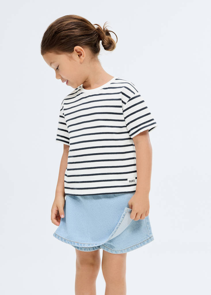 Tissu en coton de style jean. Coupe courte. Jupe short. Coupe croisée. Taille mi-haute. Fermeture à bouton sur le devant. Fermeture éclair au dos