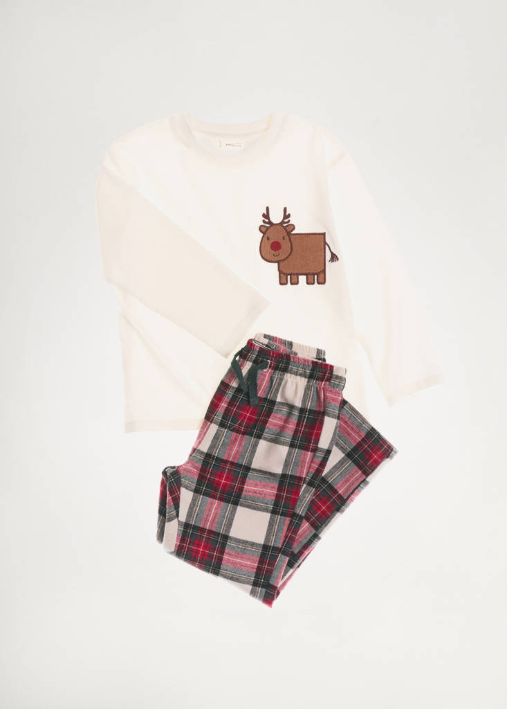 Collection Noël. Pack de t-shirt et pantalon de pyjama. 100 % coton. Coupe droite. Détail brodé. Imprimé de Noël. Col rond. Manche longue. Design long. Motif à carreaux. Taille élastique avec fermeture à nœud