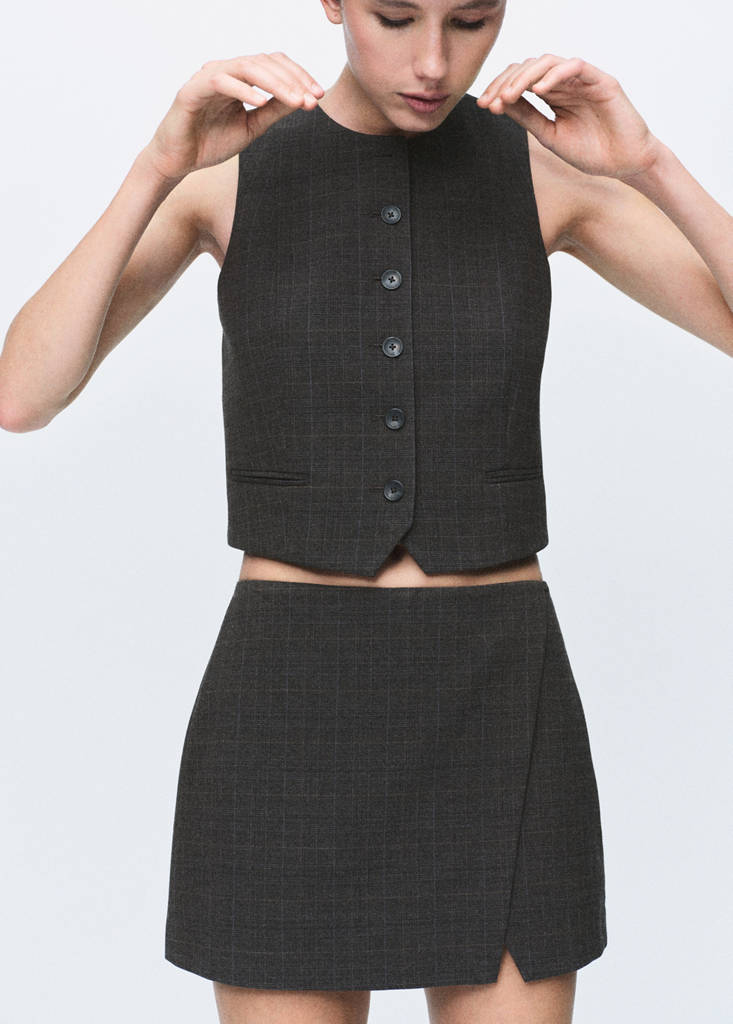 Coupe courte. Coupe croisée. Motif à carreaux. Taille mi-haute. Fermeture éclair latérale