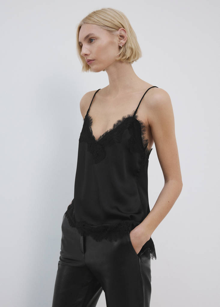 Tissu satiné. Coupe asymétrique. Coupe droite. Encolure en V. Bretelles fines. Liserés en dentelle. Sans fermeture. Ce vêtement appartient à notre collection fêtes et événements qui est conçue pour sublimer votre look lors d'occasions spéciales