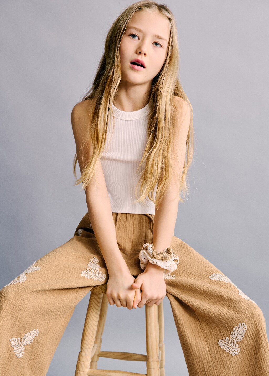 Tissu 100% coton. Tissu texturé. Coupe droite. Design long. Taille élastiquée. Taille élastique avec fermeture à nœud. Détails brodés.