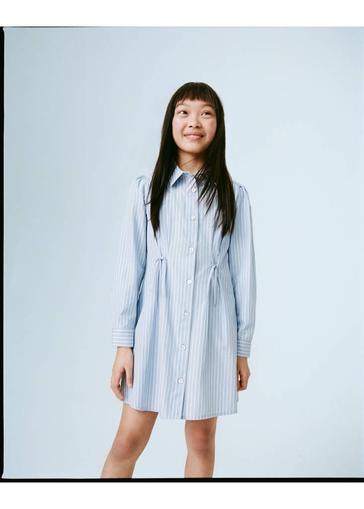 Tissu de coton. Motif rayé. Coupe courte. Détail froncé sur les épaules. Nœuds décoratifs sur les côtés. Col chemise. Manche longue. Poignets boutonnés. Fermeture avant avec boutons