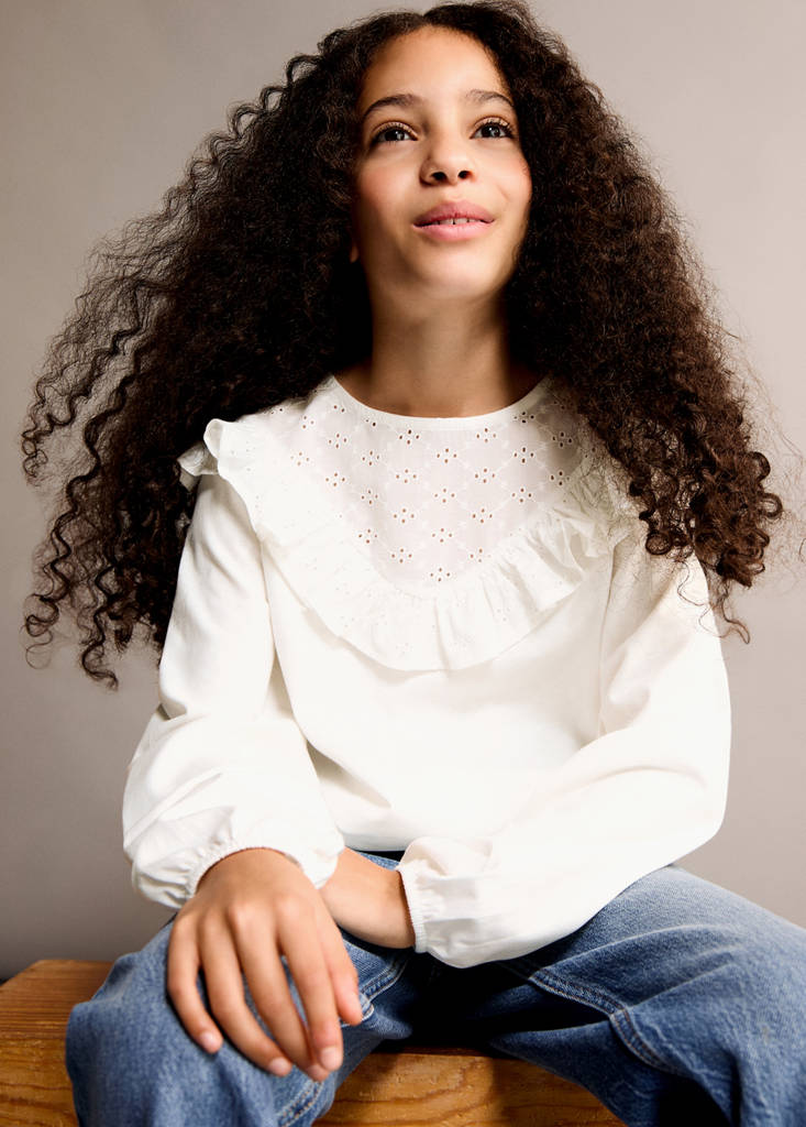 100 % coton. Coupe droite. Col rond. Détails brodés. Volants décoratifs. Manche longue. Fermeture par bouton à l'arrière