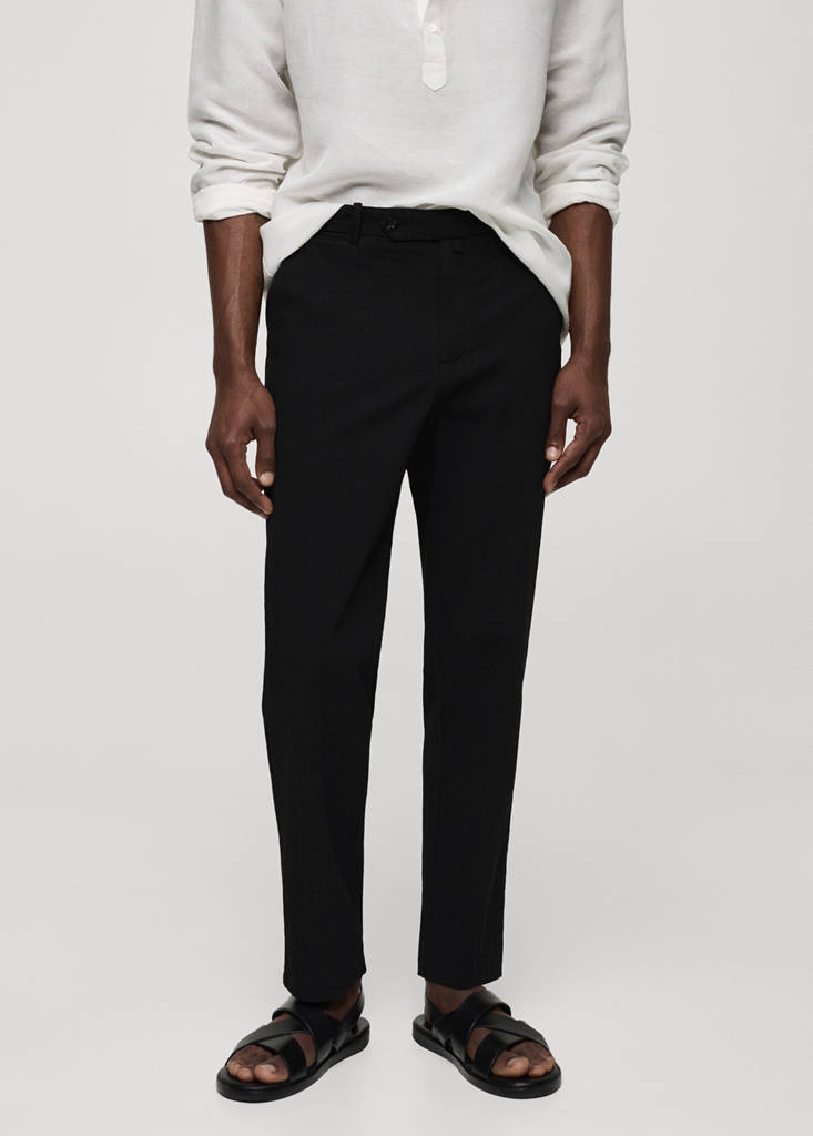 Slim fit. Tissu en coton. Tissu seersucker. Passants de ceinture. Fermeture avant à double boutonnage et fermeture éclair. Deux poches avant. Deux poches passepoilées avec bouton à l'arrière. Taille élastiquée à l'arrière