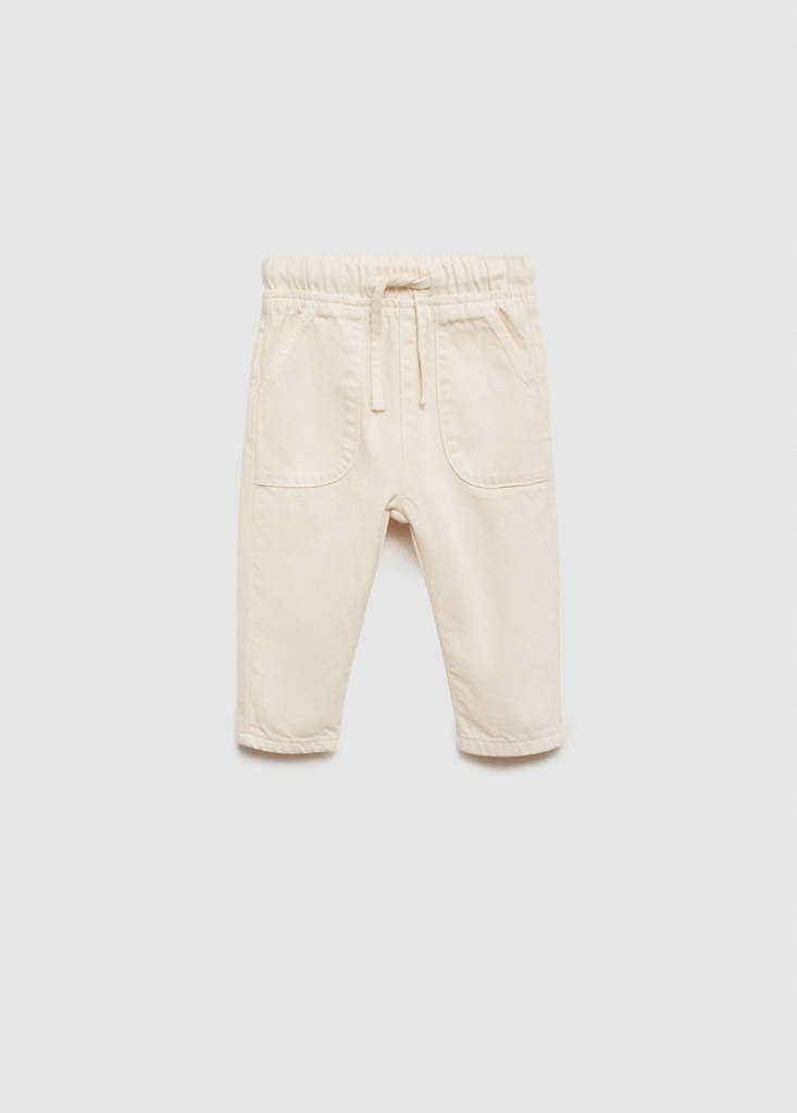 100 % coton. Coupe droite. Taille élastique avec cordon ajustable. Deux poches latérales. Design long. Revers. Ensemble disponible en total look