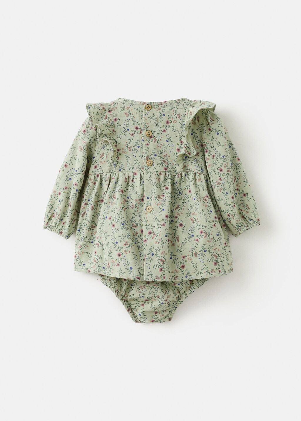 Tissu 100% coton. Col rond. Manches longues avec poignets élastiques. Fermeture à boutons sur le devant. Détail de volants sur les épaules. Broderie à fleurs. Barboteuse brodée coton. Barboteuse avec finitions élastiques.