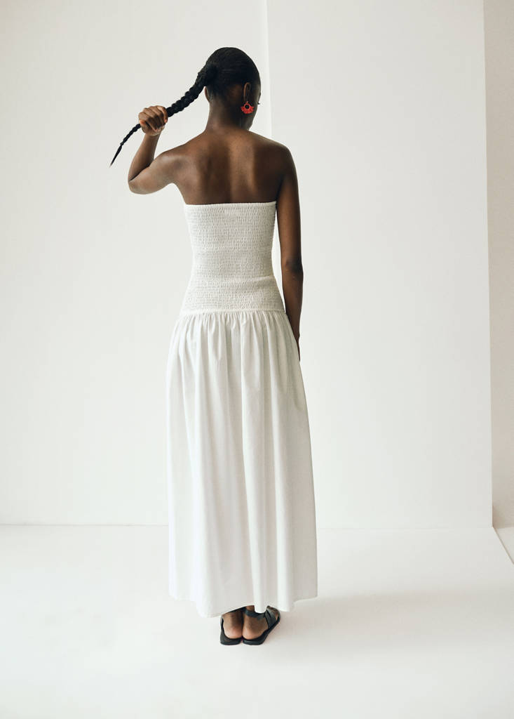 Tissu 100 % coton. Design maxi long. Design évasé. Encolure bustier. Corps de la robe empiècement nid d’abeille. Détail froncé à la taille. Sans fermeture. Sans doublure intérieure