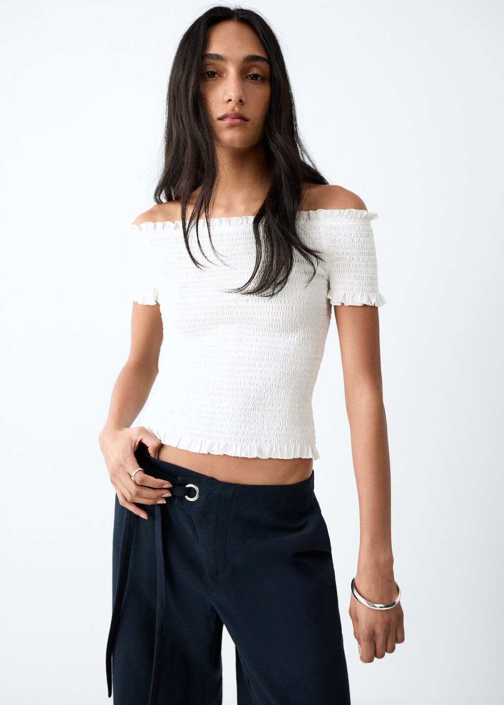 Tissu 100% coton. Tissu froncé. Bustier. Manche courte.