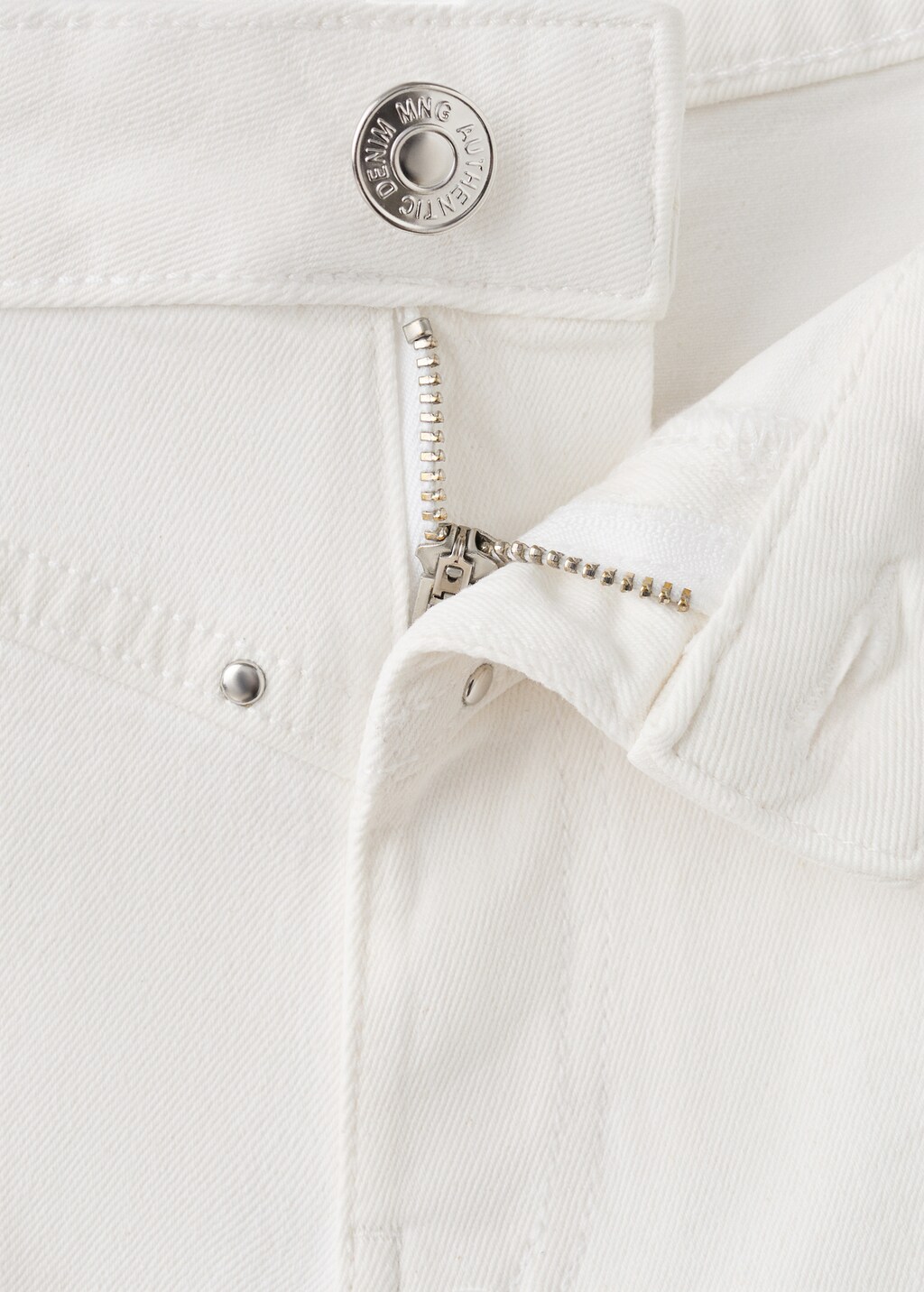 Tissu en coton style denim cowboy. Coupe regular. Design court. Deux poches avant. Deux poches plaquées à l’arrière. Passants pour ceinture. Fermeture par bouton et zip. Détail de clous.
