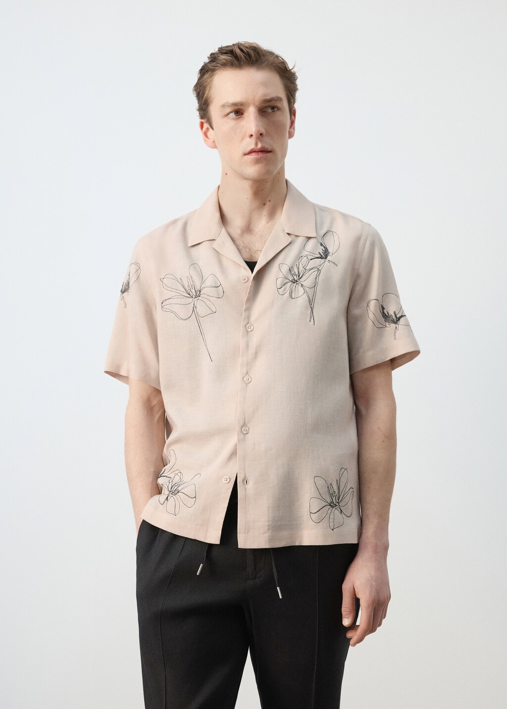 Regular Fit. Leinen-Mix. Florales Print-Design. Bowlingkragen. Kurzarm. Vorderer Verschluss mit Knöpfen