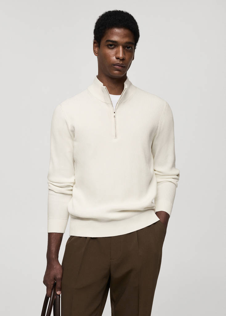 Die Modelle in Schokoladenbraun und Himmelblau sind exklusiv online erhältlich. Gewebe aus Baumwoll- und Polyestergemisch. Feinstrick. Regular Fit. Geflochtene Rippenstruktur. Halbhoher Kragen mit Reißverschluss. Gerippte Abschlüsse an Kragen, Ärmel und unterem Saum
