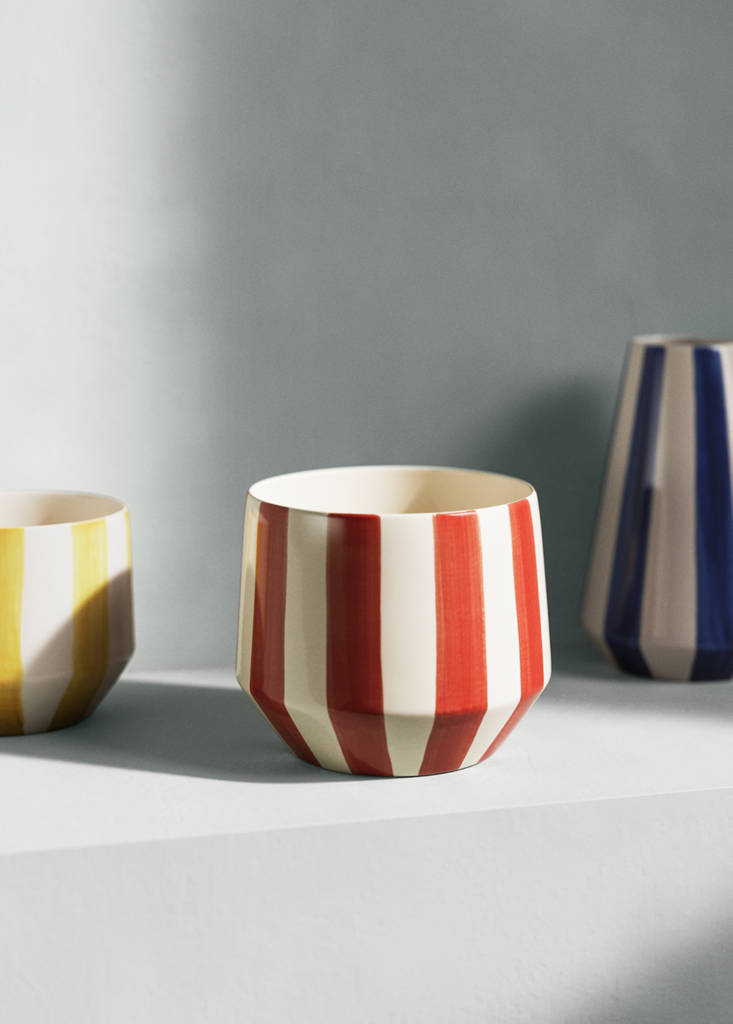 100 % Keramik. Hergestellt in Portugal. Handbemalt. 100% Keramik-Blumentopf mit handbemalten Streifen, die ihm einen einzigartigen, farbenfrohen und zeitgenössischen Charakter verleihen. Verbindet botanische Pflege mit Ästhetik und Funktionalität. In zwei Farben erhältlich