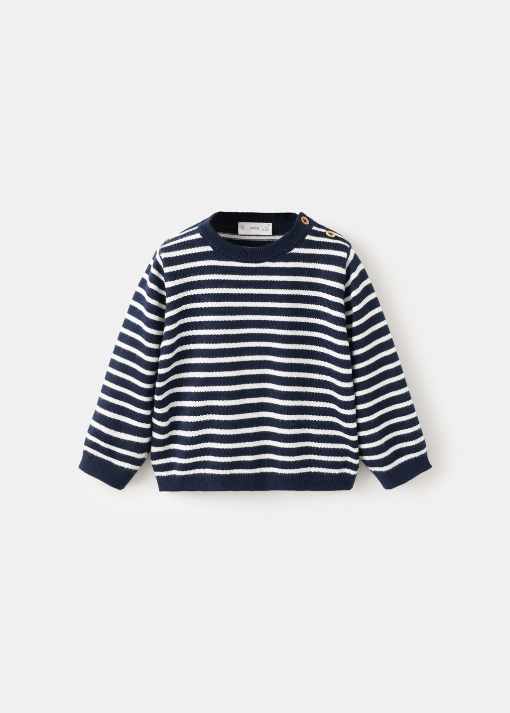 Gestrickter Stoff. Baumwollgewebe. Gerades Design. Geknöpfter Rundhalsausschnitt. Lange Ärmel. Gerippter Kragen, Bündchen und Saum.