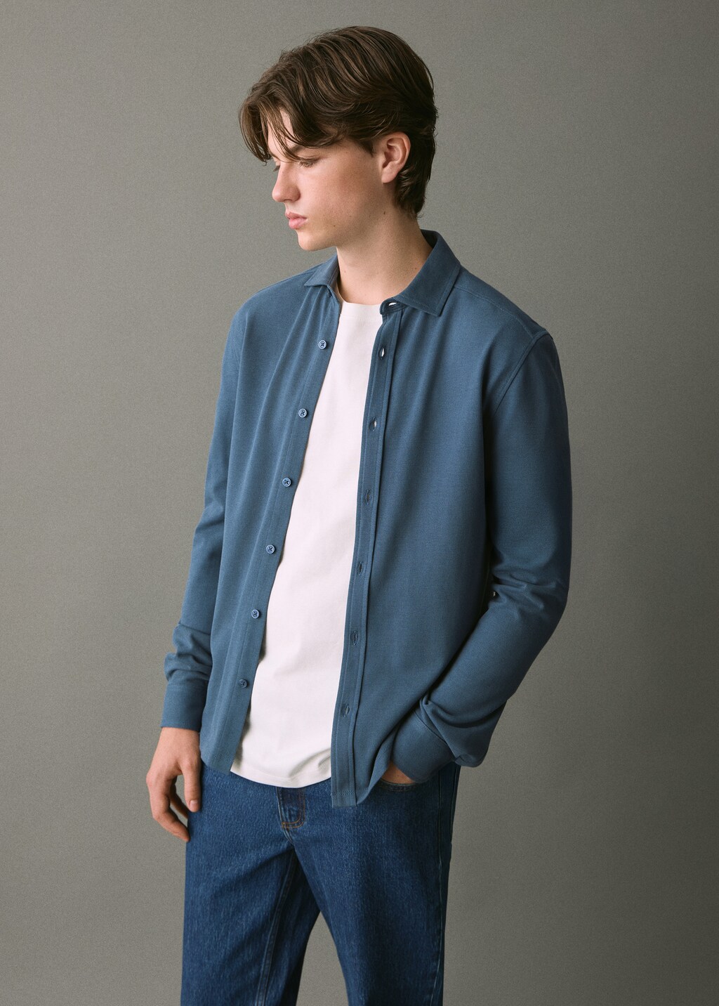100% Baumwolle. Gerades Design. Polokragen. Vorderer Verschluss mit Knöpfen. Lange Ärmel mit Knopfmanschetten. Seitlicher Schlitz am Saum.