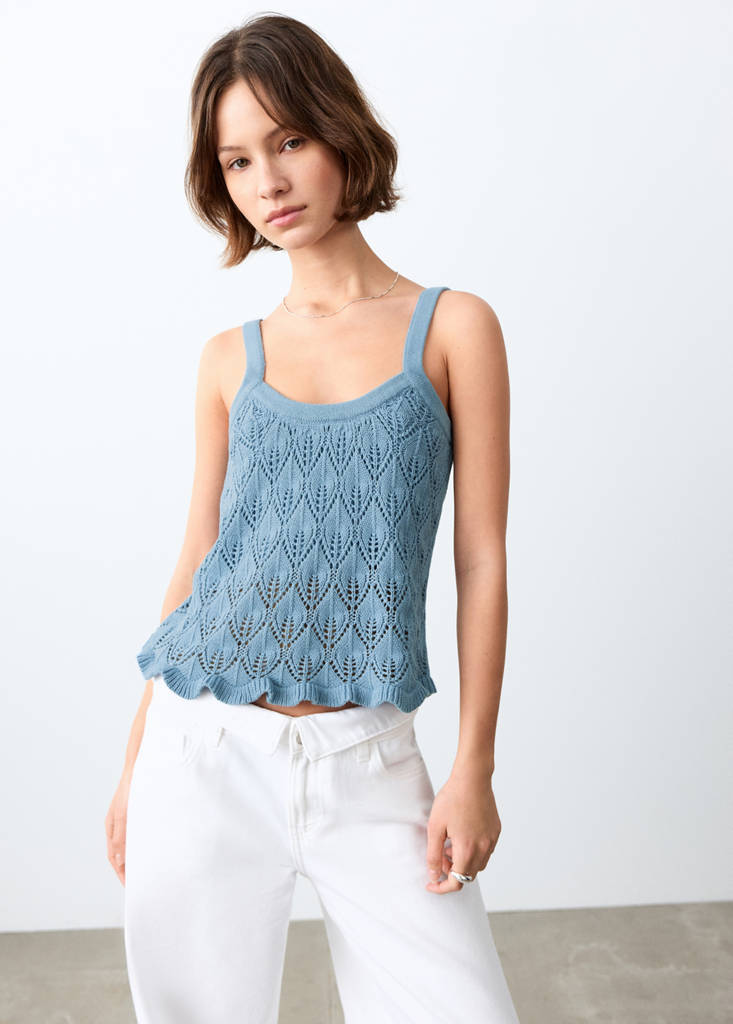 100% Baumwolle. Lochstrick. Gerades Design. Rundhalsausschnitt. Träger. Rüschendetails am Saum