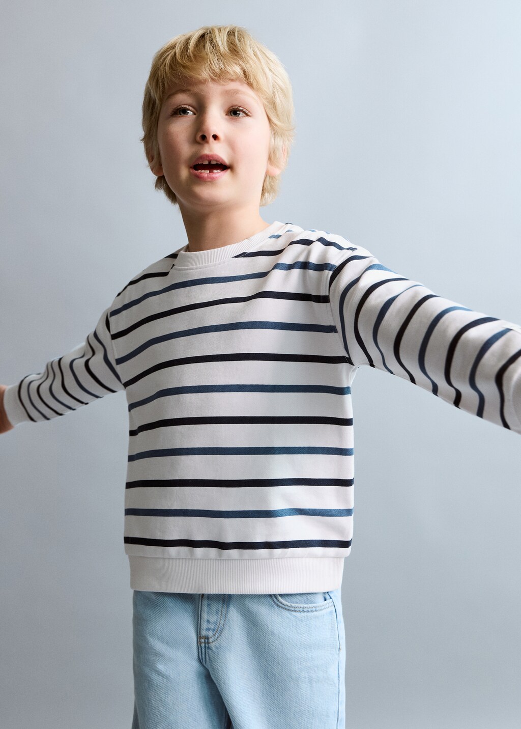 Tissu 100% coton. Coupe droite. Design à rayures bicolores. Col rond. Manche longue. Col, poignets et ourlet côtelés.
