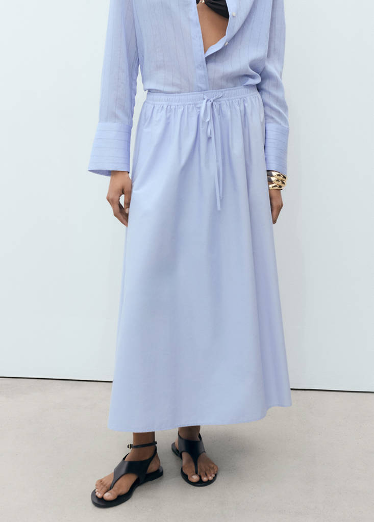 Tissu 100 % coton. Design long. Design évasé. Taille mi-haute. Deux poches latérales. Taille élastiquée. Cordon réglable. Sans fermeture