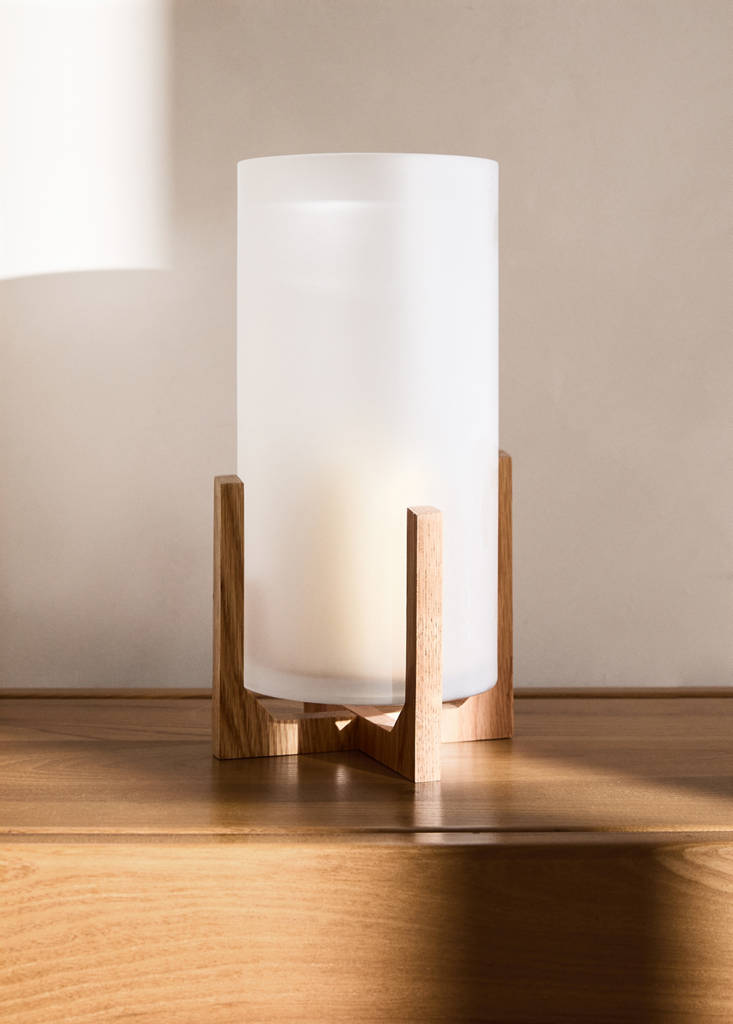 Verre : 90 % Pied : bois de chêne. Hauteur : 33 cm. Largeur : 18 cm. Photophore haut en verre sur pied en bois de chêne au design minimaliste et élégant. La structure principale est constituée d'un cylindre de verre, ce qui lui confère un aspect opaque et uniforme, idéal pour adoucir la lumière et créer une atmosphère chaleureuse. Disponible en deux tailles