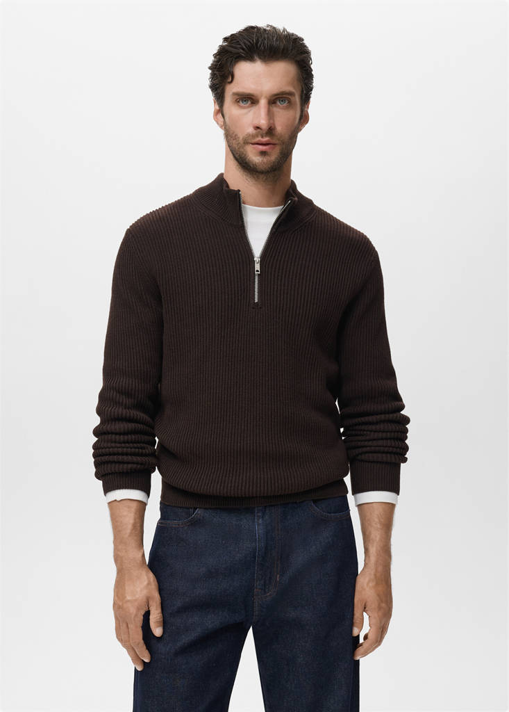 Silhouette droite. Tissu 100 % coton. Tissu en maille côtelée. Col montant à fermeture Éclair. Manches longues avec poignets élastiques. Col, manches et bas finis en côte