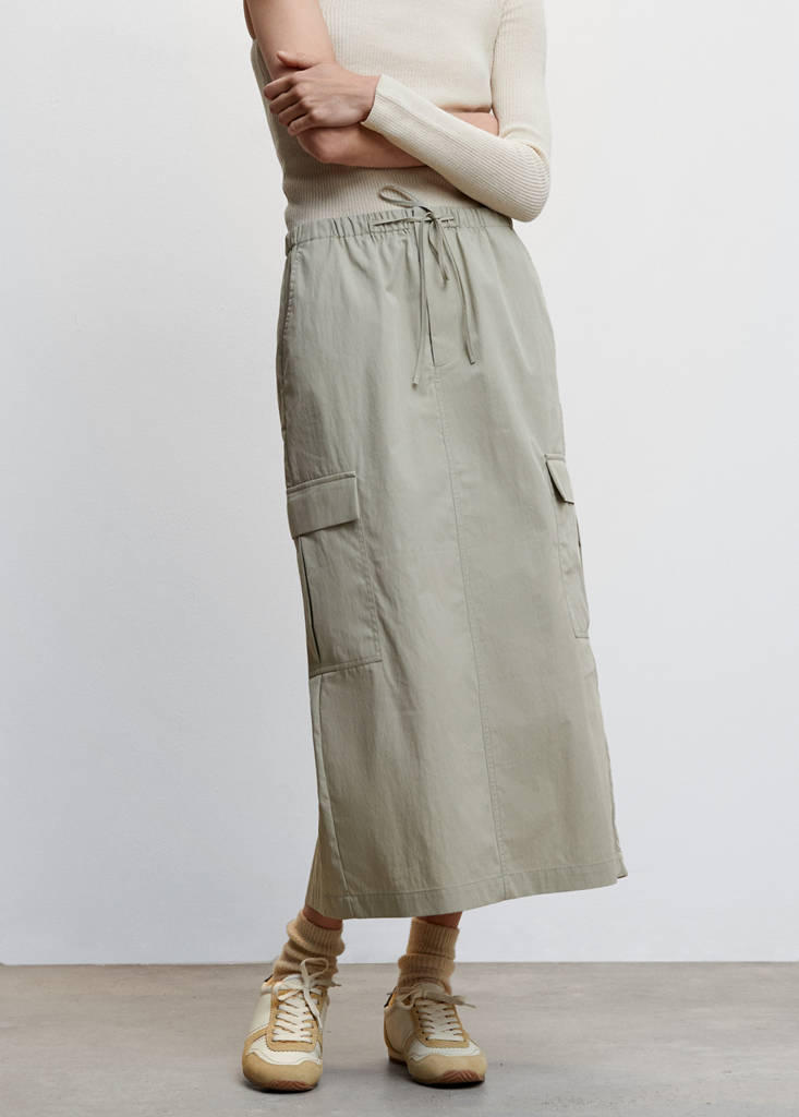 Tissu de coton mélangé. Design cargo. Coupe droite. Coupe midi. Taille élastiquée. Deux poches cargo. Poche à rabat à l'arrière. Fermeture à nouer. Saison des festivals