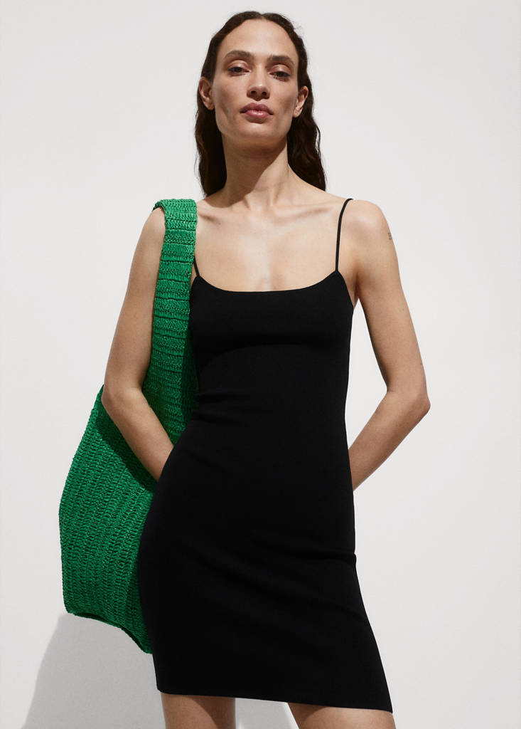 Tissu en maille fine. Coupe courte. Col carré. Bretelles fines. Saison des festivals. Coupe cintrée