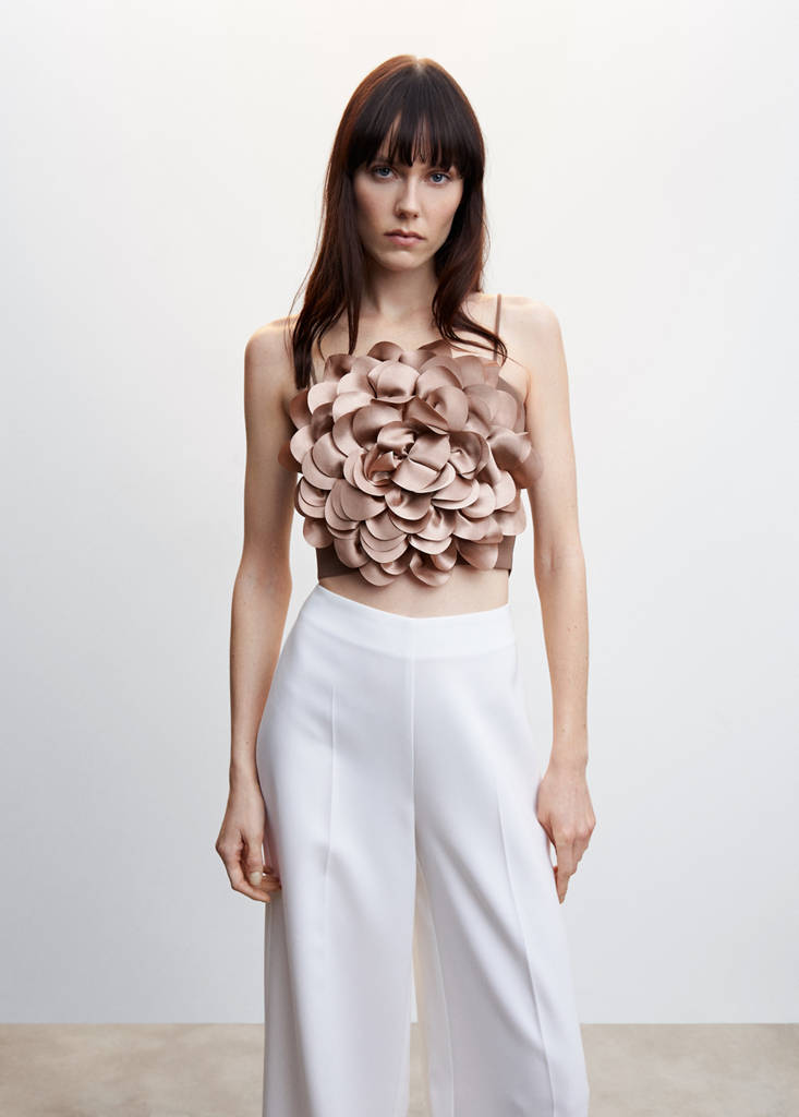 Tissu en maille fine. Tissu élastique. Coupe cintrée. Style crop. Col droit. Bretelles fines. Sans fermeture. Ornement fleur. Collection fêtes et cérémonies. Saison des festivals