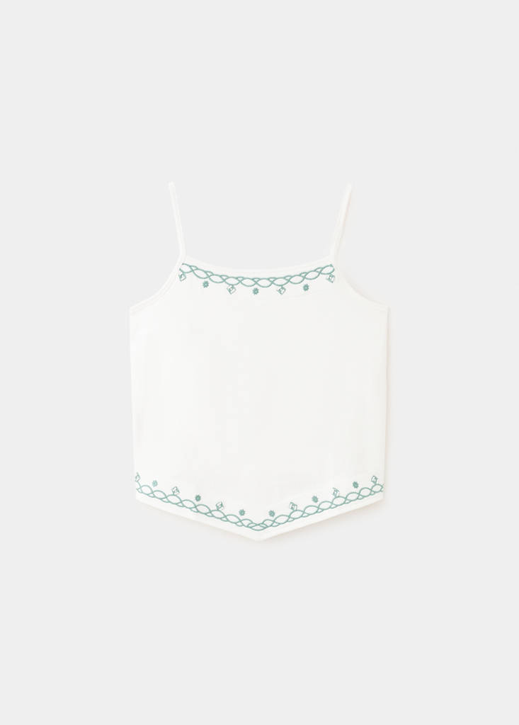 Tissu 100 % coton. Coupe droite. Col rond. Bretelles fines. Ourlet asymétrique. Détails de broderie en contraste