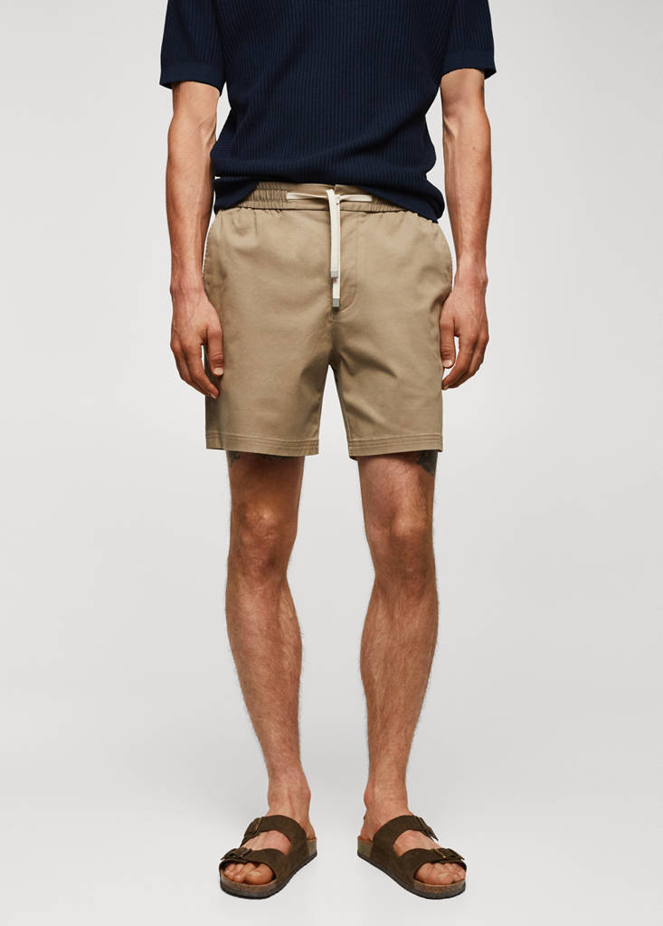 Tissu de coton légèrement extensible. Slim fit. Coupe courte. Fronce élastique à l’avant. Cordon de serrage à la taille. Fermeture Éclair avec agrafe et bouton dissimulés. Deux poches avant. Deux poches passepoilées à l'arrière