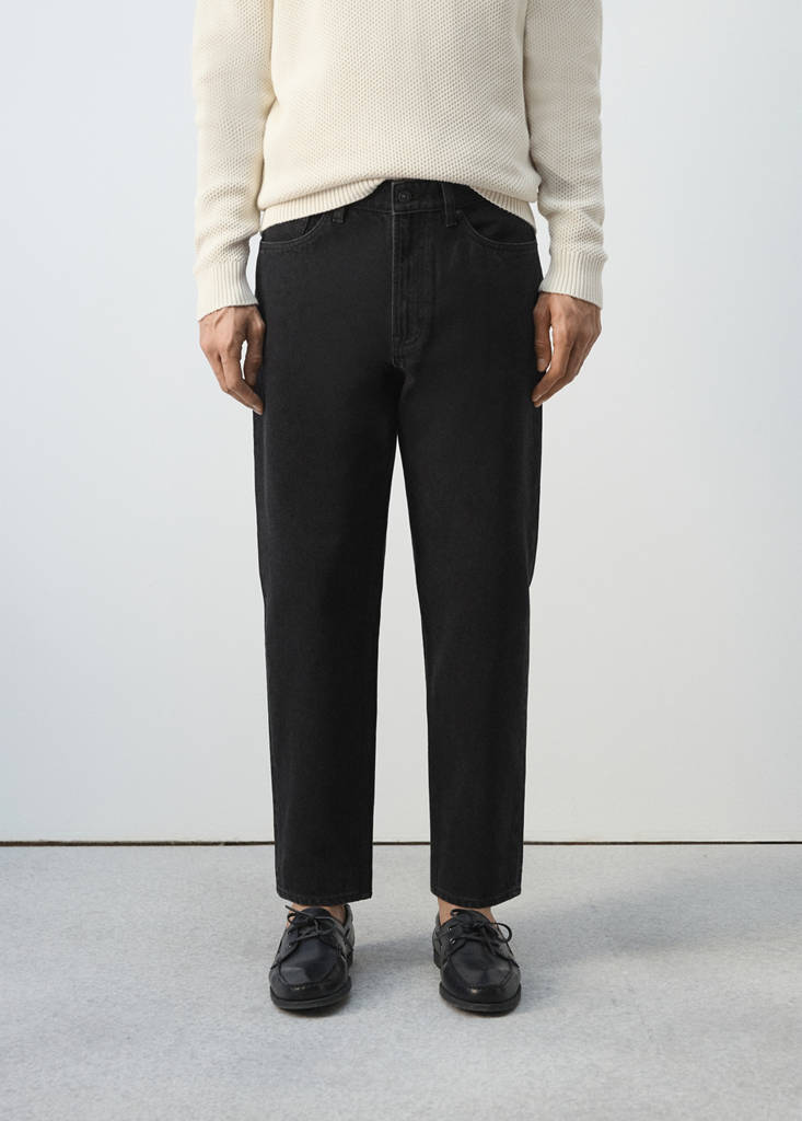 Tissu style jean cowboy 100% coton. Silhouette Carotte. Tapered-fit : coupe large en haut qui se resserre depuis le genou jusqu’à la cheville. Bas crop. Fermeture par bouton et zip. Passants pour ceinture. Deux poches goussets. Deux poches plaquées à l'arrière.