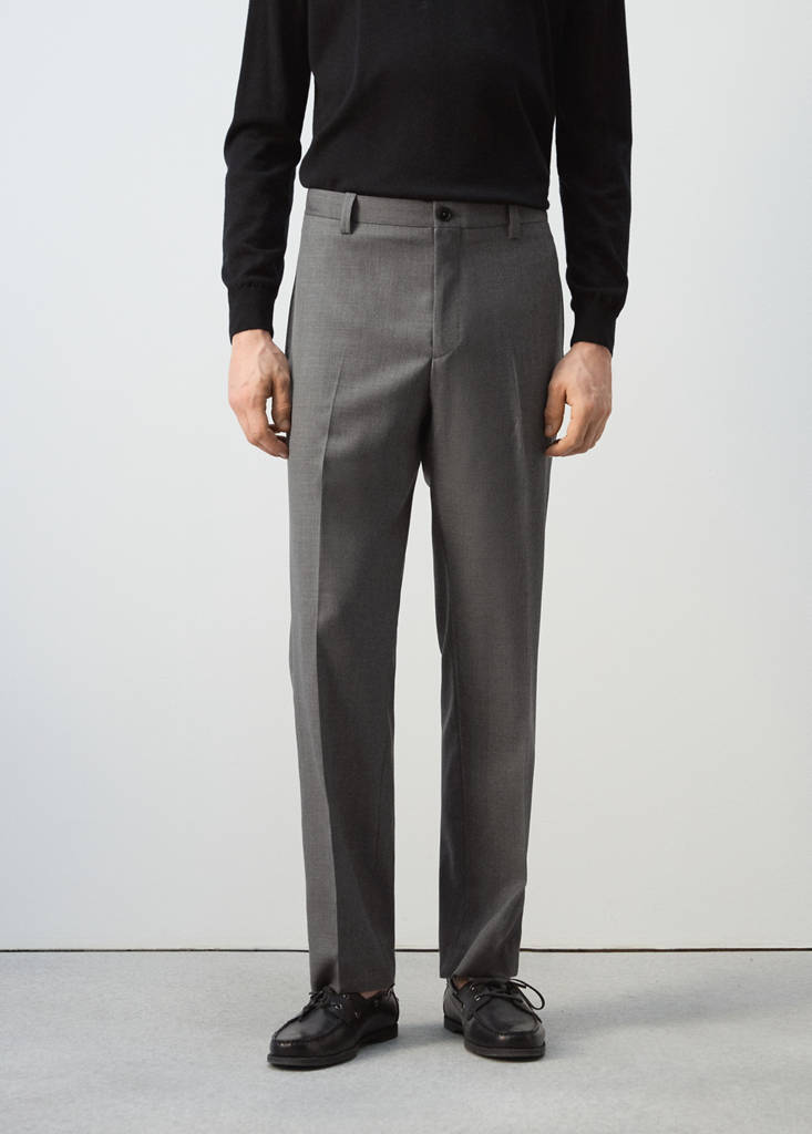 Coupe regular. Fermeture avant à double boutonnage et fermeture éclair. Passants à la taille. Deux poches avant. Deux poches passepoilées à l'arrière. Détail de pli marqué à l'avant et à l'arrière.