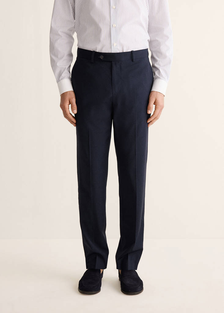 Slim fit. Tissu 100 % laine vierge. Longueur standard. Détail de pli marqué à l'avant et à l'arrière. Passants pour ceinture. Deux poches latérales. Double bouton et fermeture Éclair