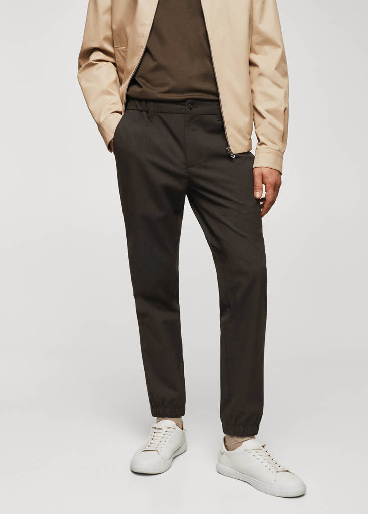Slim fit. Tissu légèrement extensible. Coupe jogging. Double bouton et fermeture Éclair. Taille avec cordon intérieur ajustable. Passants de ceinture. Deux poches avant. Bas élastiqué. Deux poches à rabat à l'arrière