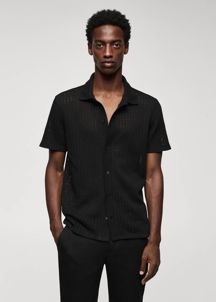 Tissu de coton et polyester mélangés. Tissu structure ajourée. Coupe regular. Manches courtes. Ourlet droit. Col classique. Fermeture avant avec boutons